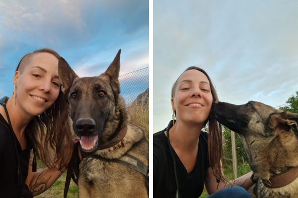 Picture of Roxy and me during our first walk. She loves to cuddle, and she’s way more photogenic than I am.